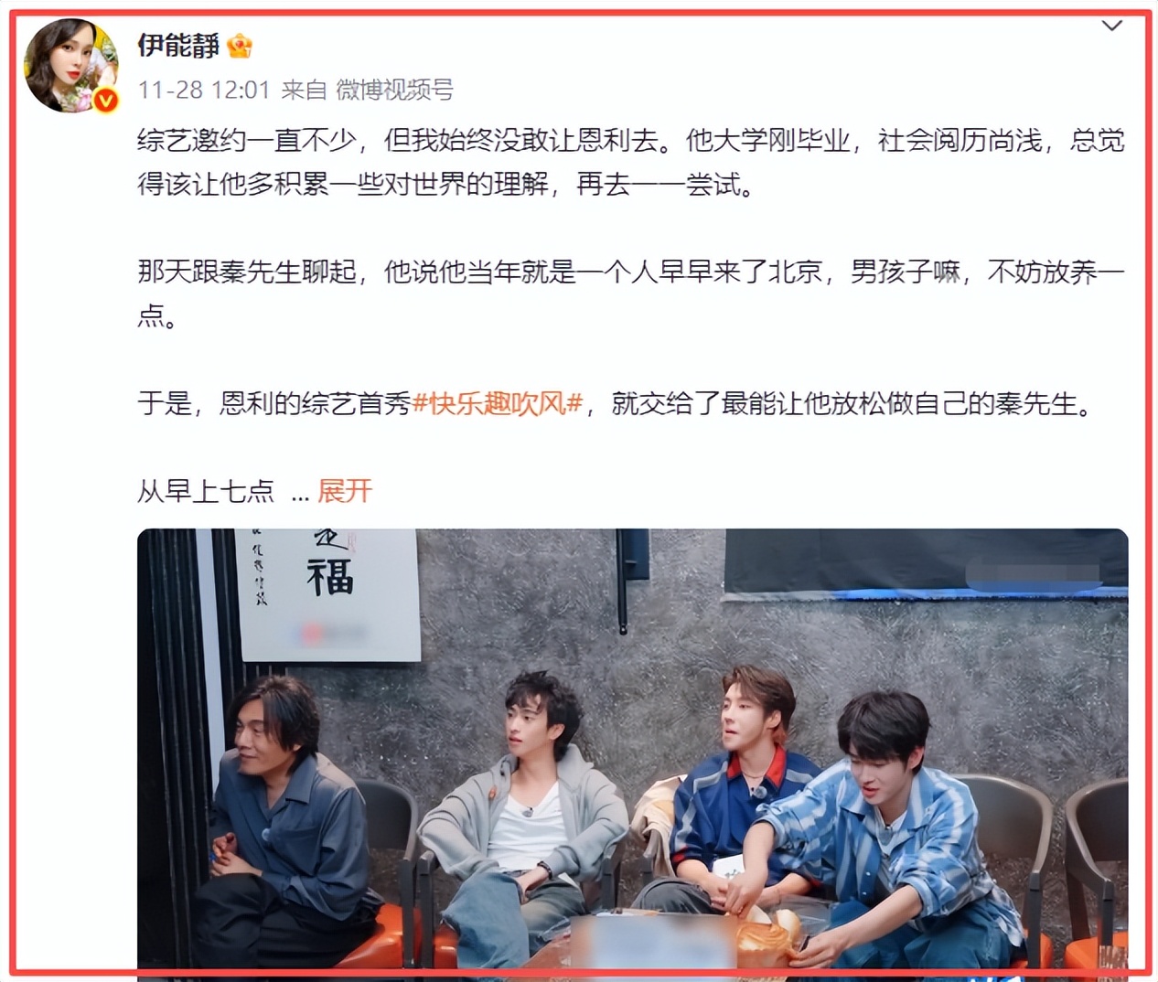 “把恩利的首秀交给最能让他放松做自己的秦先生,我很放心”。微博里,伊能静还爆料了恩利鲜为人知的一面: