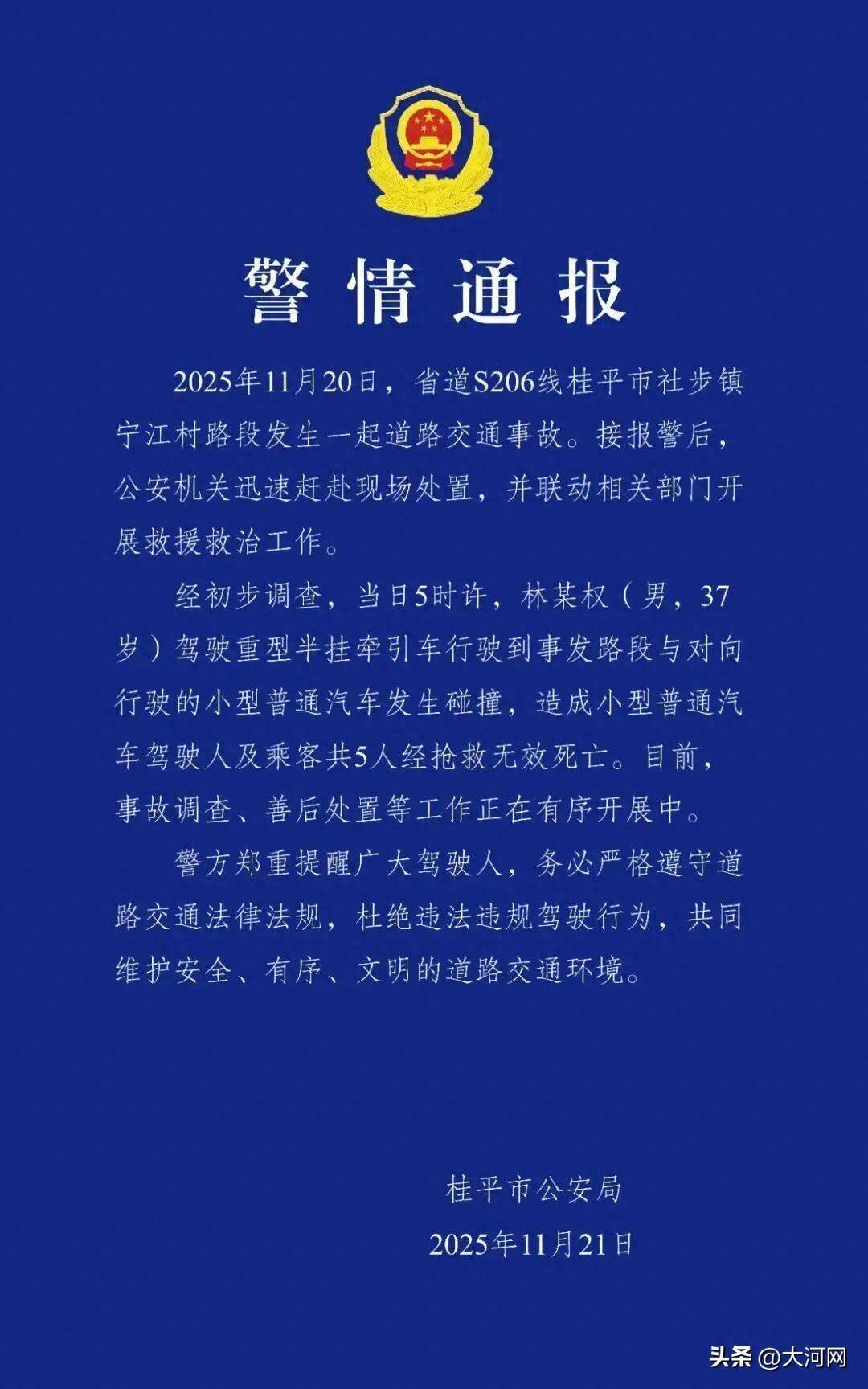 通报显示括普投资,经初步调查,当日5时许,林某权(男,37岁)驾驶重型半挂牵引车行驶到事发路段与对向行驶的小型普通汽车发生碰撞,造成小型普通汽车驾驶人及乘客共5人经抢救无效死亡。